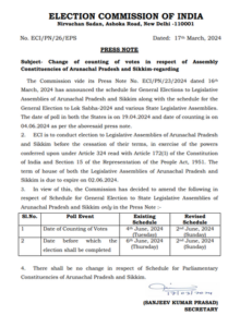 Assembly Election 2024 नई दिल्ली । चुनाव आयोग ने अरुणाचल प्रदेश और सिक्किम में होने वाले विधानासभा चुनाव की मतगणना की तारीख बदल दी है। इलेक्शन कमीशन ने पहले काउंटिंग की तारीख 4 जून घोषित की थी। इसे बदलकर अब 2 जून कर दिया है।