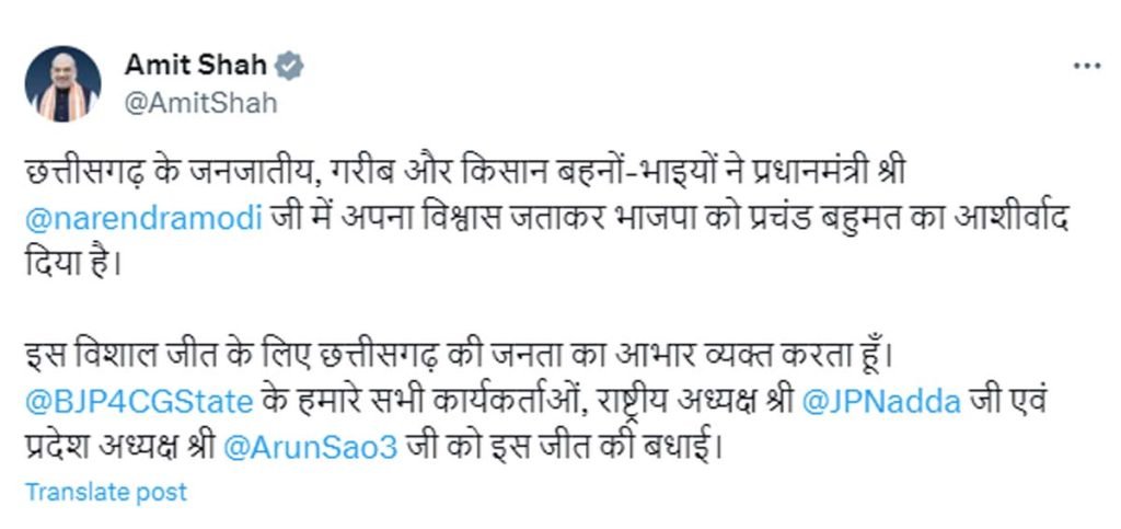 BJP को मिली प्रचंड जीत पर अमित शाह ने छत्तीसगढ़वासियो का ट्वीट कर जताया आभार