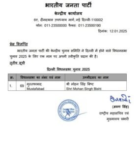 BJP Candidate Listदिल्ली विधानसभा चुनाव को लेकर भारतीय जनता पार्टी (भाजपा) ने तीसरी सूची जारी की है, जिसमें एक उम्मीदवार का नाम है। भाजपा ने मुस्तफाबाद सीट से मोहन सिंह बिष्ट को चुनाव मैदान में उतारा है। भाजपा अब तक 59 उम्मीदवारों की घोषणा कर चुकी है। इससे पहले कल यानी शनिवार रात को 29 उम्मीदवारों की अपनी दूसरी सूची जारी की थी। जिसमें पार्टी ने कपिल मिश्रा को करावल नगर से टिकट दिया है।