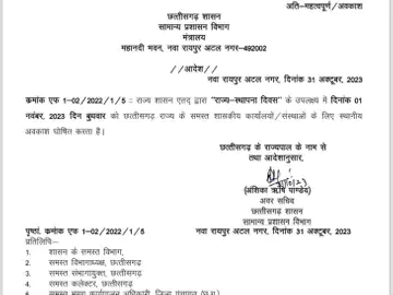 CG में राज्य स्थापना दिवस का अवकाश घोषित…देखिए आदेश
