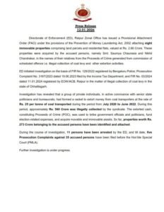 CG Coal Scam: ईडी ने बताया कि कोल लेवी मामले की जांच के दौरान अब तक 11 लोगों को गिरफ्तार किया जा चुका है। वहीं, इस मामले में कुल 35 आरोपियों के खिलाफ पांच अभियोजन शिकायतें (चालान) विशेष अदालत में पेश की गई हैं। प्रवर्तन निदेशालय के अनुसार, कोल लेवी घोटाले में अब तक 273 करोड़ रुपये से अधिक की संपत्तियां अटैच की जा चुकी हैं। एजेंसी ने स्पष्ट किया है कि मामले में आगे की जांच जारी है और आने वाले समय में और भी खुलासे व कार्रवाई संभव है। ईडी द्वारा जारी प्रेस नोट में कहा गया है कि यह कार्रवाई धन शोधन निवारण अधिनियम (PMLA) के तहत की गई है और मामले से जुड़े सभी पहलुओं की गहन जांच की जा रही है।