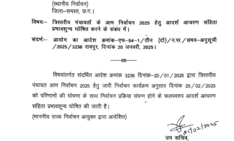 CG Daily News छत्तीसगढ़ में त्रिस्तरीय पंचायत आम चुनाव 2025 की प्रक्रिया पूरी होने के साथ ही आदर्श आचार संहिता समाप्त हो गई। राज्य निर्वाचन आयोग ने इस संबंध में आदेश जारी कर सभी संबंधित अधिकारियों को सूचित कर दिया है।