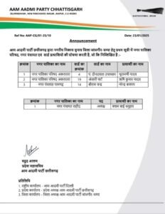 CG Latest News छत्तीसगढ़ में आगामी नगरीय निकाय चुनाव को लेकर आम आदमी पार्टी (आप) ने अपने प्रत्याशियों की सूची जारी कर दी है। पार्टी ने पहले चरण में रायपुर, दुर्ग, बिलासपुर, कोरबा, सक्ति और जांजगीर-चांपा जैसे शहरों में वार्ड स्तर के प्रत्याशियों का ऐलान किया है।