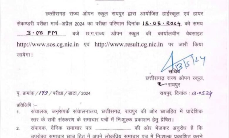 Cg News रायपुर 14 may 2024। माध्यमिक शिक्षा मंडल की तरफ से 10वीं 12वीं बोर्ड के नतीजे जारी होने के बाद अब राज्य ओपन स्कूल की तरफ से भी परीक्षा परिणाम जारी किए जाएंगे। राज्य ओपन स्कूल की तरफ से कल दोपहर बाद परीक्षा परिणाम जारी किया जाएगा।