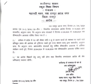Cg News : छत्तीसगढ़ में कल से होगी गरमी की छुट्टी, शिक्षा विभाग ने जारी किया आदेश