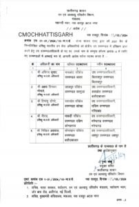 Cg News जारी आदेश के अनुसार, अभिनव कुमार को उप मंडलाधिकारी बिलासपुर भेजा गया है। वहीं अजय दिनक भोसले को उप मंडलाधिकारी कसडोल में नियुक्त किया गया है। इसके अलावा हिमांशु डांगरे को उप मंडलाधिकारी राजिम भेजा गया है। नीरज को उप मंडलाधिकारी मनेंद्रगढ़ तो निखिल अग्रवाल को जशपुर उप मंडलाधिकारी नियुक्त किया गया है।