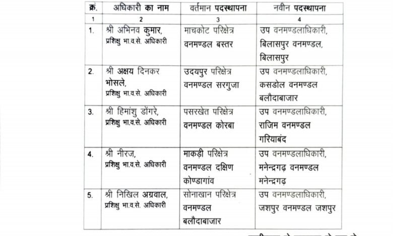 Cg News: वन विभाग के अधिकारियों का हुआ ट्रांसफर,कई अधिकारियों को किया गया इधर से उधर,देखे लिस्ट