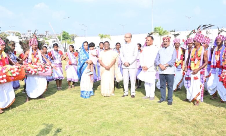 इस अवसर पर राष्ट्रपति श्रीमती मुर्मु के स्वागत में जशपुर जिले से आए करमा नर्तक दल ने मनमोहक शैली में नृत्य प्रस्तुत किया। इन मंजे हुए कलाकारों की मांदर की थाप पर लयबद्ध प्रस्तुति देखकर राष्ट्रपति श्रीमती द्रौपदी मुर्मु ने करमा नर्तक दलों के बीच पहुंचकर उनका उत्साहवर्धन किया और उनके साथ फोटो खिंचवाई।