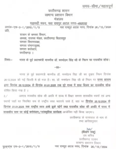 पूर्व पीएम मनमोहन सिंह के निधन पर छत्तीसगढ़ में राजकीय शोक को लेकर आदेश जारी…
