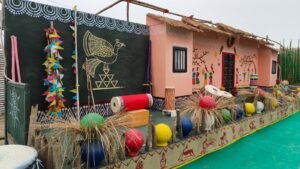 पैवेलियन के भीतर प्रवेश करते ही बांयी तरफ छत्तीसगढ़ के जीवंत ग्रामीण परिवेश को दिखाया गया है। यहां पर परंपरागत ग्रामीण जीवन के साथ ही आदिवासी कला, संस्कृति, आभूषण, वस्त्र समेत एक संपूर्ण गांव का चित्रण स्थापित किया गया है।