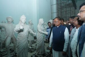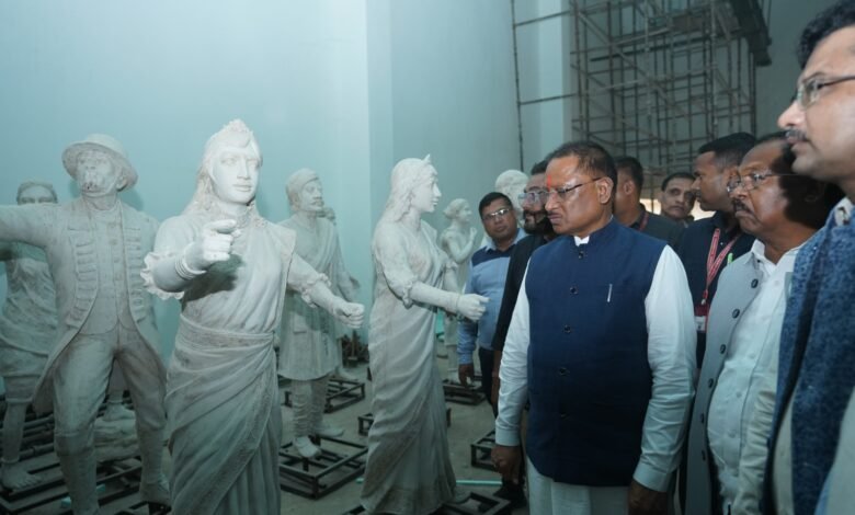 रायपुर, 29 अगस्त 2024/ मुख्यमंत्री श्री विष्णु देव साय ने आज नवा रायपुर में आदिम जाति अनुसंधान एवं प्रशिक्षण संस्थान के समीप बन रहे ‘शहीद वीर नारायण सिंह आदिवासी स्वतंत्रता संग्राम सेनानी संग्रहालय‘ का निरीक्षण किया। छत्तीसगढ़ के आदिवासी वीर स्वतंत्रता सेनानियों को समर्पित इस संग्रहालय का निर्माण 45 करोड़ रूपए की लागत से लगभग 10 एकड़ भूमि पर किया जा रहा है। मुख्यमंत्री के साथ आदिम जाति विकास मंत्री श्री रामविचार नेताम भी कार्य की प्रगति देखने पहुंचे। मुख्यमंत्री श्री साय ने संग्रहालय में मूर्तियों, अन्य कलाकृतियों तथा विभिन्न मॉडलों का अवलोकन किया। उन्होंने मूर्तियों का निर्माण कर रहे शिल्पकारों से चर्चा कर उनकी कला के बारे में जानकारी ली।