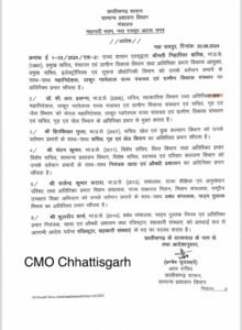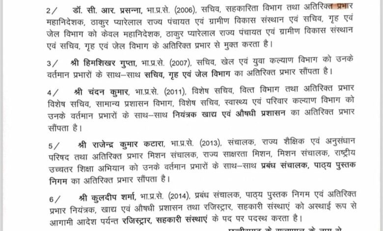 इसी तरह डॉ. सी. आर. प्रसन्ना (2006) सचिव, सहकारिता विभाग तथा अतिरिक्त प्रभार महानिदेशक, ठाकुर प्यारेलाल राज्य पंचायत एवं ग्रामीण विकास संस्थान एवं सचिव, (CG IAS Latest Transfer List August 2024) गृह एवं जेल विभाग को केवल महानिदेशक, ठाकुर प्यारेलाल राज्य पंचायत एवं ग्रामीण विकास संस्थान एवं सचिव, गृह एवं जेल विभाग के अतिरिक्त प्रभार से मुक्त किया गया है।