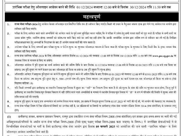 छत्तीसगढ़ लोक सेवा आयोग सीजीपीएससी का फॉर्म 1 दिसंबर 2024 से शुरू होकर 31 दिसंबर 2024 तक चलेगा। इस संबंध में विभागीय नोटिफिकेशन आज 26 नवंबर 2024 को जारी किया गया है। बता दें छत्तीसगढ़ राज्य सेवा परीक्षा 246 पदों पर भर्ती हेतु ऑनलाइन आवेदन एक दिसंबर 2024 से शुरू हो जाएगा।