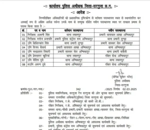 CG Police Transfer List: सरगुजा पुलिस विभाग में बड़े पैमाने पर फेरबदल किया गया है। इसमें टीआई, एसआई और एएसआई सहित 8 पुलिसकर्मियों को एक स्थान से दूसरे स्थान पर स्थानांतरित किया गया है। यह ट्रांसफर लिस्ट एसपी योगेश पटेल द्वारा जारी की गई है। जारी आदेश के अनुसार, 2 निरीक्षक, 5 उप-निरीक्षक और 1 सहायक उप-निरीक्षक का तबादला किया गया है।