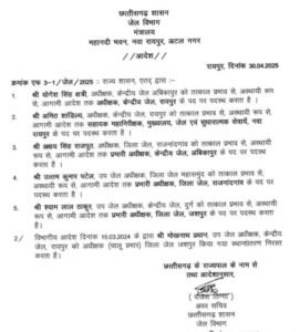 CG Transfer List 2025योगेश सिंह क्षत्री को केन्द्रीय जेल रायपुर के अधीक्षक के पद पर पदस्थ किया गया है।