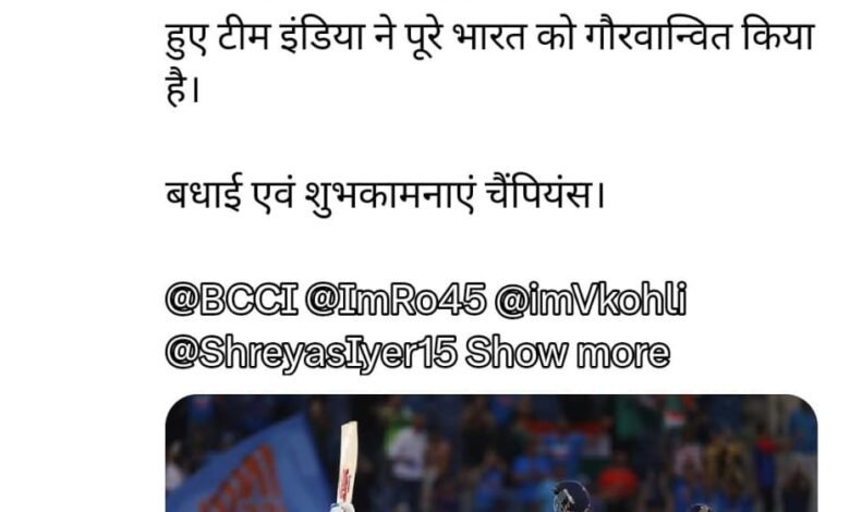 Chhatisgarh Latest News: रायपुर 23 फरवरी 2025/ मुख्यमंत्री श्री विष्णु देव साय ने आईसीसी चैंपियंस ट्राफी में पाकिस्तान के विरुद्ध शानदार जीत पर टीम इंडिया को बधाई और शुभकामनाएं दी है।
