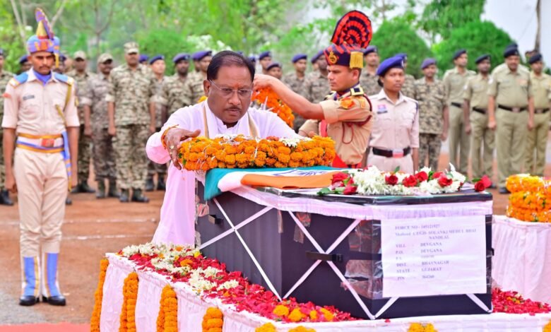 Chhatisgarh News:   रायपुर, 23 मई 2025/ मुख्यमंत्री श्री विष्णु देव साय ने बीजापुर जिले के उसूर क्षेत्र में नक्सल विरोधी अभियान के दौरान अदम्य साहस का परिचय देते हुए शहीद सीआरपीएफ कोबरा बटालियन के कांस्टेबल श्री सोलंकी मेहुल भाई नंदलाल को भावभीनी श्रद्धांजलि अर्पित की और पार्थिव शरीर को कंधा देकर उनके गृह राज्य रवानगी से पूर्व अंतिम विदाई दी। मुख्यमंत्री आज माना स्थित चौथी वाहिनी छत्तीसगढ़ सशस्त्र बल परिसर पहुंचकर शहीद के पार्थिव शरीर पर पुष्पचक्र अर्पित किए और उन्हें नमन किया।