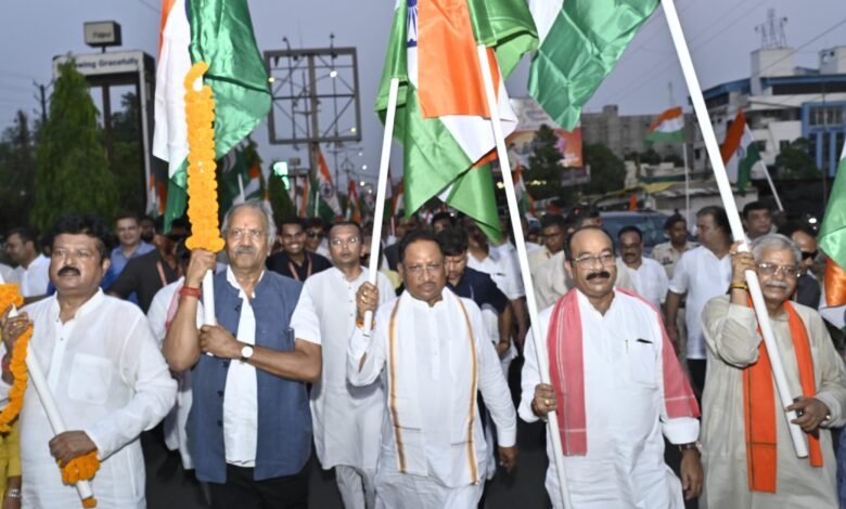 Chhatisgarh Samachar :    रायपुर14 मई 2025/ मुख्यमंत्री श्री विष्णु देव साय आज राजधानी रायपुर में आयोजित तिरंगा यात्रा में शामिल हुए। उन्होंने कहा कि राष्ट्र की सुरक्षा की जब भी बात आएगी हम सभी एक हैं। देश के, अपने प्रधानमंत्री श्री नरेंद्र मोदी और अपनी सेना के साथ हैं। उन्होंने कहा कि तिरंगा यात्रा में सभी वर्गों के लोग, सेवानिवृत्त सैनिक, समाज सेवी संगठन, आम नागरिक, महिला एवं पुरुष, बच्चों ने बड़ी संख्या में शामिल होकर एकजुटता, देशभक्ति, राष्ट्रीय गौरव का संदेश दिया है।