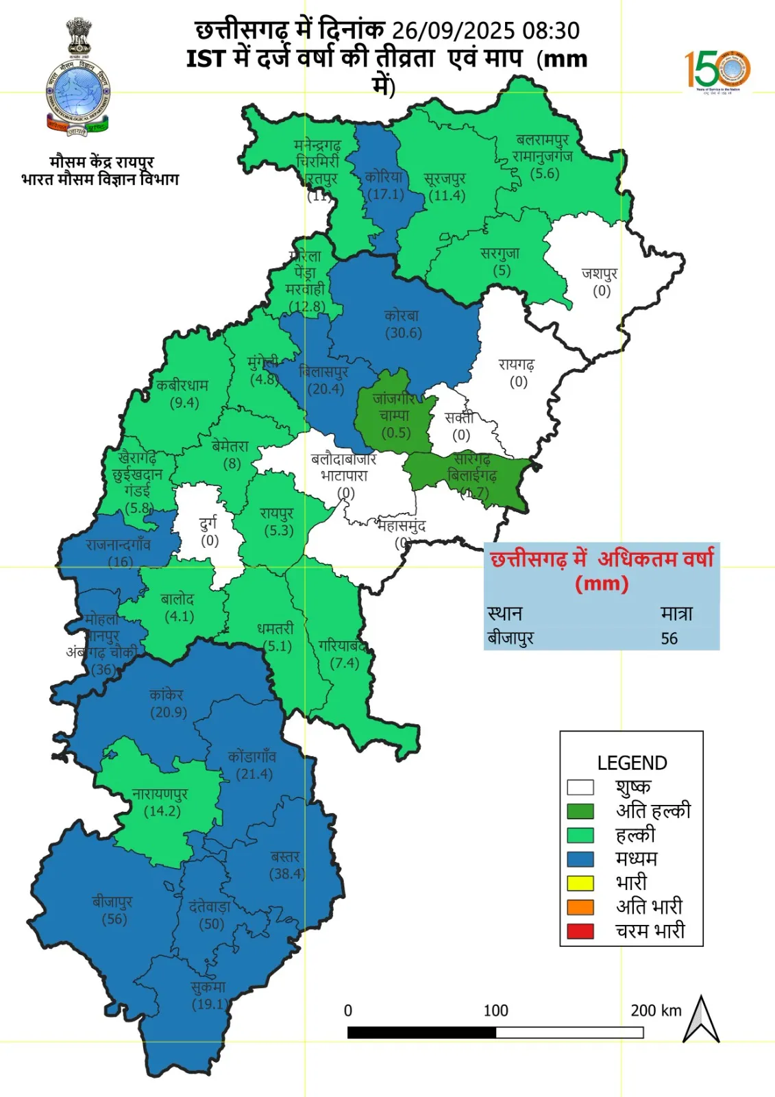 पिछले 24 घंटों में छत्तीसगढ़ के विभिन्न जिलों में हल्की से मध्यम वर्षा (light to moderate rainfall) दर्ज की गई है। बीजापुर जिले में सर्वाधिक 56.0 मिमी वर्षा दर्ज की गई, जो पूरे प्रदेश में सबसे ज्यादा रही। इसके अलावा दंतेवाड़ा, बड़े बचेली, गीदम जैसे स्थानों पर भी अच्छी बारिश देखने को मिली।