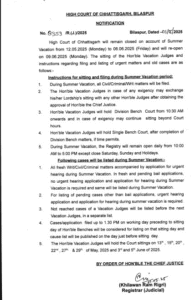 Chhattisgarh Latest News छत्तीसगढ़ हाईकोर्ट की ग्रीष्मकालीन छुट्टियों (Summer Vacation) की तारीखों में बड़ा बदलाव किया गया है। बिलासपुर हाईकोर्ट ने वर्ष 2025 के लिए अपने कैलेंडर में आंशिक संशोधन करते हुए ग्रीष्मावकाश आगे बढ़ा दिया है। इस अनुसार 12 मई से शुरू होने वाला अवकाश अब 2 जून से शुरू होगा। यह निर्णय मुख्य न्यायाधीश (Chief Justice) के निर्देश पर लिया गया और इसे रजिस्ट्रार जनरल (Registrar General) द्वारा जारी अधिसूचना में सार्वजनिक किया गया।