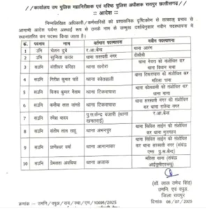 Chhattisgarh Latest News छत्तीसगढ़ की राजधानी रायपुर (Raipur Police Transfer News) में पुलिस महकमे में एक बार फिर बड़ा प्रशासनिक बदलाव किया गया है। रायपुर एसएसपी डॉ. लाल उमेद सिंह (SSP Dr. Lal Umed Singh) ने रविवार को 10 पुलिस अधिकारियों के ट्रांसफर (Police Transfer Order Raipur) का आदेश जारी किया। इनमें 2 सब-इंस्पेक्टर (Sub-Inspector Transfer Raipur) और 8 सहायक उप निरीक्षक (ASI Transfer Raipur) शामिल हैं।