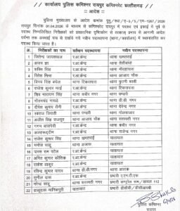 Chhattisgarh news छत्तीसगढ़ की राजधानी रायपुर में पुलिस महकमे में एक बार फिर बड़ा फेरबदल हुआ है। राजधानी के कई थानों के प्रभारी बदले गए हैं। रायपुर आए नए थानेदारों को थाने का प्रभार दिए गए हैं।