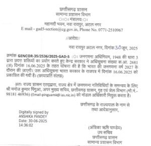 Chhattisgarh Today News छत्तीसगढ़ शासन के गृह, जेल विभाग के अपर मुख्य सचिव मनोज पिंगुआ को राज्य शासन ने बड़ी जिम्मेदारी सौंपी है। सरकार ने मनोज पिंगुआ को 2027 में प्रस्तावित राष्ट्रीय जनगणना कार्यक्रम के लिए नोडल अधिकारी नियुक्त किया है। इस संबंध में आदेश भी जारी कर दिया गया है। आदेश में बताया गया है कि, जनगणना अधिनियम, 1948 की धारा 3 द्वारा प्रदत्त शक्तियों का प्रयोग करते हुए केन्द्र सरकार ने अधिसूचना संख्या क. आ. 2681 (अ) दिनांक 16.06.2025 के तहत घोषणा की है कि भारत की जनगणना वर्ष 2027 के दौरान की जाएगी। उक्त अधिसूचना भारत सरकार के राजपत्र में दिनांक 16.06.2025 को प्रकाशित की गयी है।