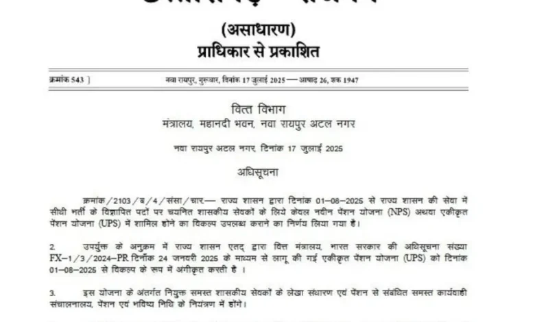 Chhattisgarh Top news। छत्तीसगढ़ सरकार ने पेंशन प्रणाली में बड़ा बदलाव करते हुए पुरानी पेंशन योजना (OPS) के विकल्प के रूप में एकीकृत पेंशन योजना (UPS) लागू कर रही है. राज्य शासन ने राजपत्र में इसका प्रकाशन कर दिया है. यह व्यवस्था 1 अगस्त 2025 से प्रभाव में आएगी.