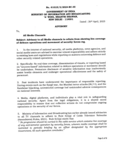 आर्मी मूवमेंट की कवरेज न करें सरकार ने सभी मीडिया हाउस से अपील की है कि डिफेंस ऑपरेशन और फोर्स के मूवमेंट की कवरेज न करें। पहलगाम हमले को लेकर भारत-पाकिस्तान के बीच जारी तनाव के मद्देनजर केंद्रीय सूचना और प्रसारण मंत्रालय ने सभी मीडिया चैनलों के लिए एक एडवाइजरी जारी की है।
