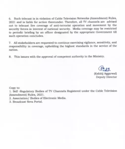 Military Operations Coverage Banयह एडवाइजरी राष्ट्रीय सुरक्षा को ध्यान में रखते हुए जारी की गई है। इसमें कहा गया है कि रक्षा अभियानों और सुरक्षा बलों की गतिविधियों का सीधा प्रसारण न करें। मंत्रालय ने कहा है, ‘राष्ट्रीय सुरक्षा के हित में, रक्षा अभियानों और सुरक्षा बलों की गतिविधियों का सीधा प्रसारण न करें।’