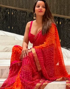 रेड-ऑरेंज कलर की बांधनी साड़ी के साथ मोनालिसा ने स्ट्रेप वाला मैचिंग ब्लाउज पेयर किया है जिसमें वे अपनी क्लीवेज फ्लॉन्ट करती दिख रही हैं.