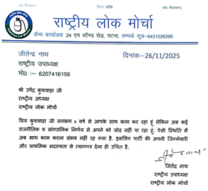 पार्टी राष्ट्रीय लोक मोर्चा (आरएलएम) के राष्ट्रीय उपाध्यक्ष जितेंद्र नाथ ने पार्टी के राष्ट्रीय अध्यक्ष उपेंद्र कुशवाहा को एक इस्तीफा पत्र लिखा। इस पत्र में उन्होंने कहा, “प्रिय कुशवाहा जी, मैं लगभग 9 वर्षों से आपके साथ काम कर रहा हूं, लेकिन अब मैं कई राजनीतिक और संगठनात्मक निर्णयों को अपने आप से नहीं जोड़ पा रहा हूं। ऐसे हालात में आपके साथ काम करना मेरे लिए संभव नहीं रहा है, इसलिए यह आवश्यक समझता हूं कि मैं पार्टी की सदस्यता और जिम्मेदारियों से इस्तीफा दूं।“