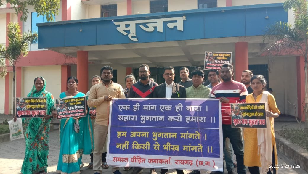 कलेक्ट्रेट के सृजन सभाकक्ष के बाहर सहारा इंडिया कंपनी के खिलाफ निवेशकों ने जमकर नारेबाजी की। इस बीच एसडीएम गगन शर्मा मिलने आए तो जनता कांग्रेस छत्तीसगढ़ (जे) के जिला अध्यक्ष आशीष उपाध्याय ने कलेक्टर श्रीमती रानू साहू के नाम उनको शिकायत पाती सौंपते हुए कहा कि जिला और पुलिस प्रशासन को पहले 5 सूत्रीय ज्ञापन दे चुके हैं। पुलिस ने सहारा के विरुद्ध प्रथम सूचना दर्ज करते हुए अनेक शिकायतों को भी संयोजित किया। जांच के आगे क्रम में डिप्टी कलेक्टर ने विगत 12 अक्टूबर को तहसीलदार को जांच कर उचित प्रतिवेदन आहूत कराने का निर्देश दिया।