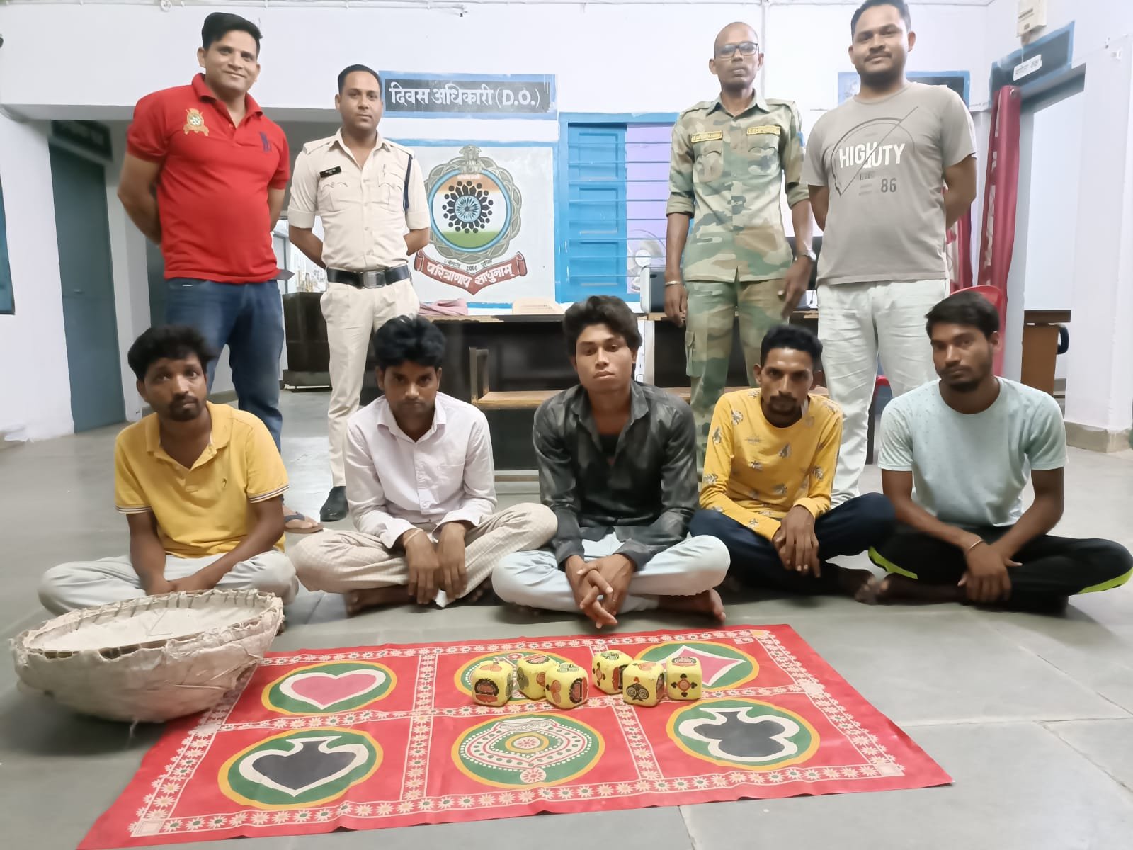 Raigarh News *रायगढ़* । थाना प्रभारी पुसौर उप निरीक्षक गिरधारी साव के नेतृत्व दिनांक 10/06/2022 को पुसौर पुलिस द्वारा मुखबिर सूचना पर ग्राम बरपाली गोठान के पास जुआ रेड कार्रवाई किया गया । पुलिस को सूचना मिली थी कि बरपाली गोठान के पास कुछ व्यक्ति खुडखुडिया पट्टी पर दांव लगाकर जुआ खेला रहे हैं । पुलिस की घेराबंदी में कुछ जुआडियान भाग गये पुलिस टीम द्वारा मौके पर आरोपी (1) रामेश्वर पटेल पिता मोतीचंद पटेल उम्र 27 वर्ष सा0 टीमरलगा थाना सारंगढ (2) देवब्रत नायक पिता बालकृष्ण नायक उम्र 24 वर्ष सा0 खोरीगांव थाना बरमकेला (3) हेमसागर साहु पिता गुलाबराम साहु उम्र 29 वर्ष सा0 बरपाली थाना पुसौर (4) भागीरथी पटेल पिता सोभाराम पटेल उम्र 32 वर्ष सा0 बरपाली (5) गोलू साव पिता हीरालाल साव उम्र 22 वर्ष सा0 बरपाली पकड़ में आये जिनके फड एवं पास से *जुमला नगदी रकम 20,300 रूपये* एवं फड से एक खडखडिया पट्टी, एक टोकरी, 6 नग खडखडिया गोटी, *5 नग मोबाईल, 1 मोटर सायकल* की जप्ती किया गया । आरोपियों पर थाना पुसौर में 4(क) जुआ एक्ट के तहत कार्यवाही किया गया है ।