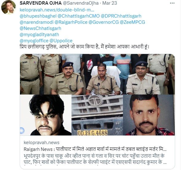 Raigarh News एसएसपी सदानंद कुमार के कुशल नेतृत्व में इस दोहरे अंधे कत्ल में आरोपियों की शीघ्र पतासाजी, गिरफ्तारी में जिले के एडिशनल एसपी संजय महादेवा, एसडीओपी खरसिया निमिषा पाण्डेय, एसडीओपी धरमजयगढ़ दीपक मिश्रा के नेतृत्व में बनाई गई पांच थानों और सायबर सेल की संयुक्त टीम द्वारा आरोपियों की शीघ्र गिरफ्तार कर सलाखों के पीछे भेजा गया । अपराध खुलासे की जानकारी सोशल मीडिया के माध्यम से मृतक के परिजनों को प्राप्त होने पर मृतक प्रवीण ओझा के भाई सर्वेन्द्र ओझा (उत्तर प्रदेश) द्वारा ट्विटर के माध्यम से प्रदेश के मुख्यमंत्री, छत्तीसगढ़ पुलिस और रायगढ़ पुलिस का आभार व्यक्त किया गया है । वहीं एसडीओपी धरमजयगढ़ दीपक मिश्रा के नेतृत्व में शेष फरार दो आरोपियों के संबंध में थाना तमनार एवं साइबर सेल की टीम जानकारी जुटाकर दबिश दी जा रही है।