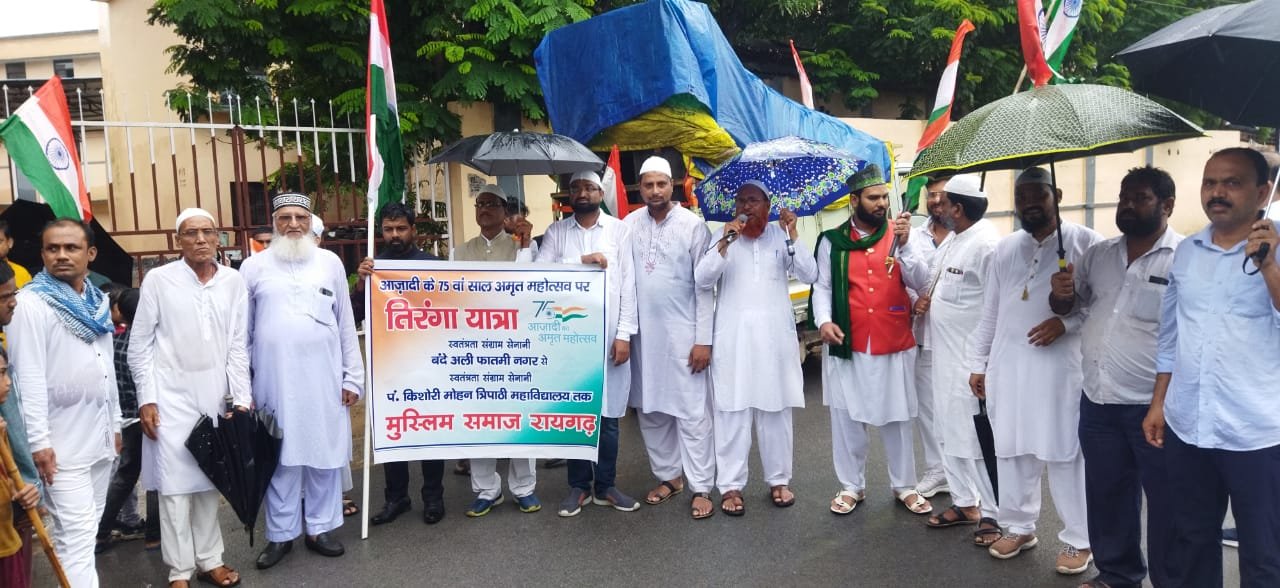 Raigarh News रायगढ़। आजादी का अमृत महोत्सव पूरे शहर में विभिन्न समाज विभिन्न संस्थानों के द्वारा मनाया गया रायगढ़ मुस्लिम समाज द्वारा अमृत महोत्सव को स्थानीय स्वतंत्रता संग्राम सेनानीयो को समर्पित करते हुए रायगढ़ के स्वतंत्रता संग्राम सेनानी बंदे अली फातमी जिनके नाम से शहर के सर्किट हाउस के पास बंदे अली फातमी नगर बसा है वहां तिरंगा यात्रा निकाली। स्वतंत्रता के अमृत महोत्सव में बारिश में बाधक नहीं बन सकी लगातार बारिश के बावजूद सैकड़ों लोगों ने बंदे अली फातमी नगर पहुंचकर उन्हें श्रद्धा सुमन कर तिरंगा यात्रा निकाली। तिरंगा यात्रा राजमहल, चांदनी चौक, पैलेस रोड गद्दी चौक, सुभाष चौक, गांधी प्रतिमा , किशोरी मोहन त्रिपाठी कन्या महाविद्यालय पहुंची। लगातार हो रही बारिश के बाद भी लोगों के उत्साह में कोई कमी नहीं हुई। तिरंगा यात्रा के दौरान आजादी के दीवानों को याद करते हुए नारे लगाए गए। विशेष कर स्वतन्त्रता संग्राम में रायगढ़ शहर के स्वतंत्रता संग्राम सेनानियों को याद करते हुए जिंदाबाद के नारे लगाए गए। सुभाष चौक पर सुभाष चंद्र बोस की प्रतिमा पर तथा गांधी चौक पहुंचकर महात्मा गांधी की प्रतिमा पर माल्यार्पण कर उन्हें श्रद्धासुमन व्यक्त किया गया। मुस्लिम समाज ने देश की महापुरुषों को याद करते हैं हुए रायगढ़ की माटी से स्वतंत्रता आंदोलन में अपना सर्वस्व निछावर करने वाले बंदे अली फातमी और पंडित किशोरी मोहन त्रिपाठी को समर्पित कर इस बात को भी रेखांकित करने की कोशिश की गई साथ ही शहर के स्वतंत्रता संग्राम सेनानियों में तोड़ा राम जोगी, रामकुमार अग्रवाल, दयाराम ठेठवार को भी याद करते हुए श्रद्धा सुमन अर्पित किया गया । स्वतंत्रता आंदोलन में सभी समाज की भागीदारी रही सभी के समन्वित प्रयास से हमें आजादी नसीब हुई है। फिरका परस्त ताकतें स्वतंत्रता संग्राम सेनानियों की मंशा के विपरीत देश में नफरत फैलाकर देश को कमजोर करना चाहते हैं उसका जवाब तिरंगा यात्रा के माध्यम से दिया गया।