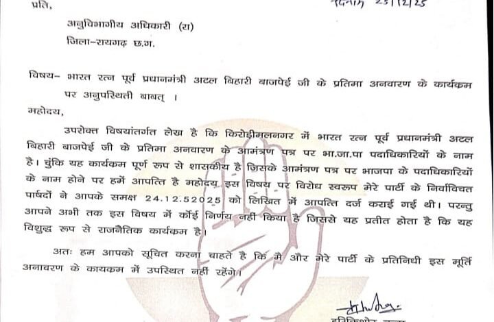 पत्र में साफ किया गया है कि इस परिस्थिति में नगर पंचायत अध्यक्ष हरिकिशोर चन्द्रा एवं कांग्रेस पार्टी के कोई भी प्रतिनिधि प्रतिमा अनावरण कार्यक्रम में शामिल नहीं होंगे।