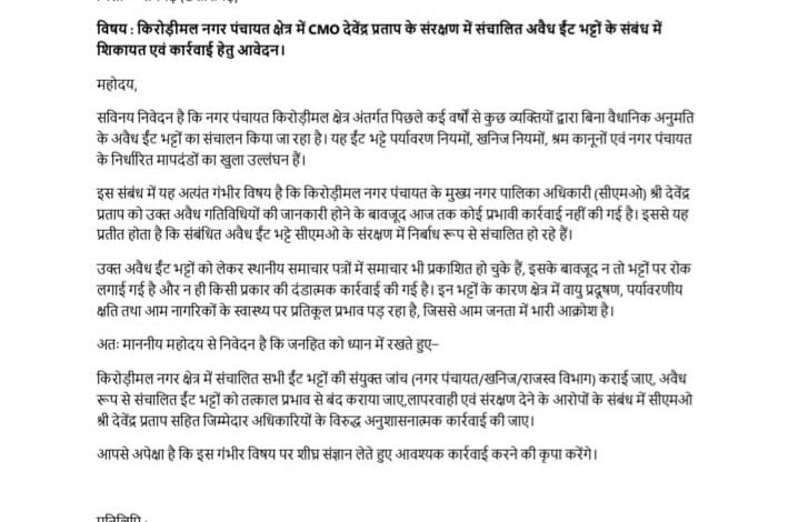 अवैध भट्टों को संरक्षण देने के आरोपों की निष्पक्ष जांच कर CMO देवेंद्र प्रताप सहित अन्य जिम्मेदार अधिकारियों पर कड़ी कार्रवाई की जाए।