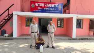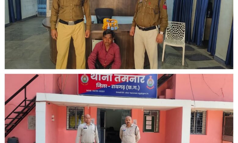 तमनार थाना क्षेत्र में थाना प्रभारी कमला पुसाम ठाकुर, सहायक उप निरीक्षक सुरीत लाल सिदार द्वारा ग्राम बागबाडी, बुडिया एवं सारसमाल क्षेत्र में पेट्रोलिंग पर थे। इस दौरान मुखबिर सूचना पर ग्राम सारसमाल में दशाई भगत (67 वर्ष) निवासी सारसमाल को पकड़ा गया। आरोपी के कब्जे से 09 लीटर हाथ भट्ठी कच्ची महुआ शराब, अनुमानित कीमत 1,800 रुपये तथा बिक्री रकम 150 रुपये जप्त की गई।