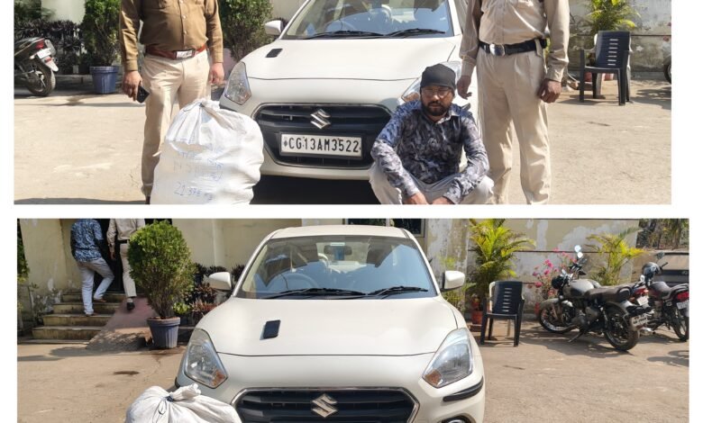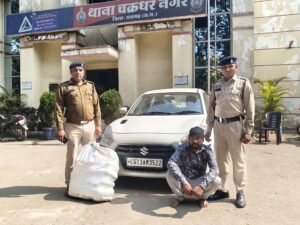 Raigarh News: *रायगढ़ 14 फरवरी* । वरिष्ठ पुलिस अधीक्षक श्री शशि मोहन सिंह के निर्देशन में जिले में मादक पदार्थों की खरीदी-बिक्री पर प्रभावी नियंत्रण के उद्देश्य से चलाए जा रहे *ऑपरेशन “आघात”* के तहत थाना चक्रधरनगर एवं साइबर थाना की संयुक्त टीम ने बड़ी कार्रवाई करते हुए एक गांजा तस्कर को गिरफ्तार किया है। पुलिस को मिले सटीक इनपुट पर कल दोपहर बालसमुंद नाला के पास पहाड़ मंदिर रोड पर नाकेबंदी कर वाहनों की सघन जांच की जा रही थी। इसी दौरान सफेद रंग की *स्विफ्ट डिजायर कार क्रमांक CG 13 AM 3522* को रोका गया। वाहन से संदिग्ध गंध आने पर चालक से पूछताछ की गई, जिसने वाहन में गांजा होना स्वीकार किया।