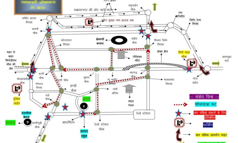 Raigarh News : दिनांक 27.03 2026 को जिला मुख्यालय में रामनवमी पर्व दौरान आयोजित भगवान श्रीराम शोभा यात्रा नटवर स्कूल प्रांगण से प्रारंभ होकर गांधी प्रतिमा तिराहा, एमजी रोड, रामनिवास टाकिज चौक, सिल्वर पैलेष तिराहा, गौरीशंकर मंदिर, न्यू मार्केट तिराहा, सुभाष चौक, गद्दी चौक, कोष्टापारा तिराहा, चांदनीचौक, गांजा चौक, हटरी चौक, सिटी कोतवाली, हण्डी चौक, घड़ी चौक एवं रामलीला मैदान समाप्त।