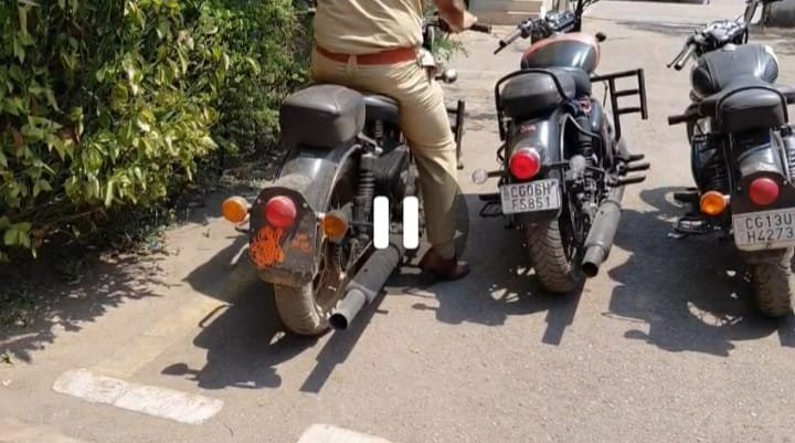 Raigarh News : मॉडिफाई साइलेंसर पर रायगढ़ पुलिस का विशेष अभियान — 11 वाहन पकड़े गए, साइलेंसर हटाकर की गई चालानी कार्रवाई – RGH NEWS