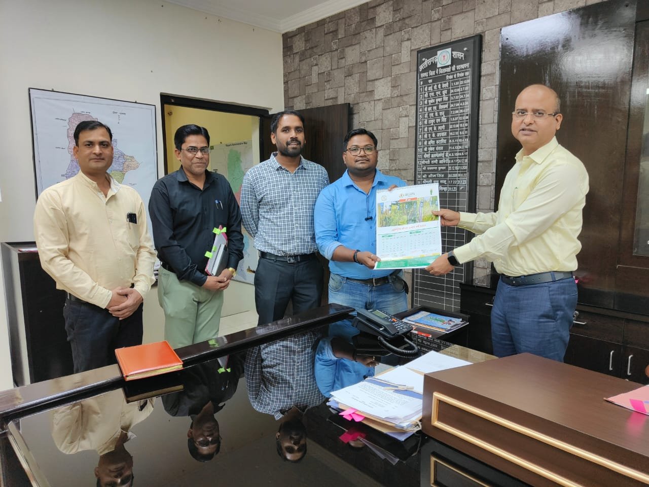 जनसामान्य में मिलेट्स के प्रति जागरूकता लाने के उद्देश्य से मिलेट्स कैलेण्डर तैयार किया गया है। जिसकी एक प्रति कलेक्टर श्री तारन प्रकाश सिन्हा को कृषि विभाग के अधिकारियों ने भेंट की। कलेक्टर श्री सिन्हा ने मिलेट्स कैलेण्डर की प्रशंसा की। मिलेट्स कैलेण्डर में मिलेट मिशन योजनांतर्गत मिलेट्स कोटो, कुटकी, रागी, ज्वार, बाजरा के पोषक गुणों एवं खाद्य सुरक्षा को दृष्टिगत रखते हुए आमजनों में जागरूकता लाने व दैनिक आहार में शामिल करने एवं उत्पादन, उत्पादकता विपणन को प्रोत्साहित करने के बारे में बताया गया है। कैलेंडर का प्रकाशन सीईओ जिला पंचायत श्री अबिनाश मिश्रा एवं डीडीए श्री अनिल कुमार वर्मा, रायगढ़ के मार्गदर्शन में तैयार किया गया। कैलेण्डर के डिजाइन एवं प्रकाशन में श्री अमित पटेल, ग्रामीण कृषि विस्तार अधिकारी, विकासखण्ड पुसौर की विशिष्ट भूमिका रही। इस मौके पर श्री अभिषेक पटेल, प्रभारी वरिष्ठ कृषि विकास अधिकारी, विकासखण्ड रायगढ़ भी उपस्थित रहे।