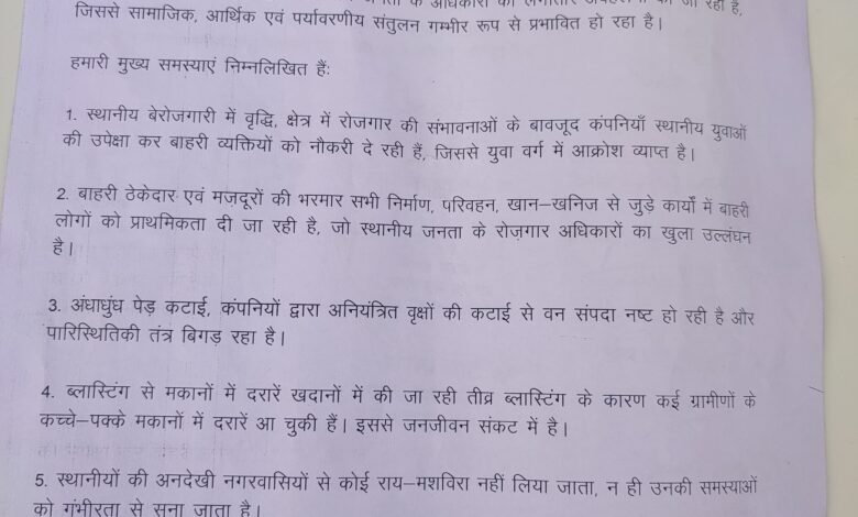 ज्ञापन में यह भी बताया गया कि कंपनियों द्वारा अंधाधुंध वृक्षों की कटाई से पारिस्थितिकी तंत्र प्रभावित हो रहा है। खदानों में की जा रही तेज़ ब्लास्टिंग के कारण ग्रामीणों के मकानों में दरारें पड़ चुकी हैं और जीवन संकट में है।
