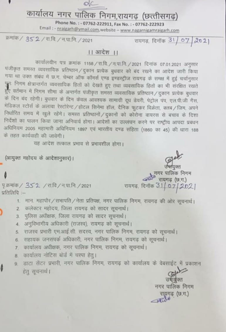 RGHNEWS ब्रेकिंग:अब रायगढ़ शहर में प्रत्येक बुधवार को बंद रहेगी पंजीकृत समस्त व्यवसायिक प्रतिष्ठान और दुकानें बुधवार को केवल आवश्यक सामग्री जैसे दूध डेयरी, पेट्रोल पंप, एलपीजी गैस, मेडिकल स्टोर्स, के अलावा रेस्टोरेंट/ होटल, सिनेमा हॉल, दैनिक फूटकर विक्रेता, क्लब/जिम अपने निर्धारित समय पर खुले रहेंगे