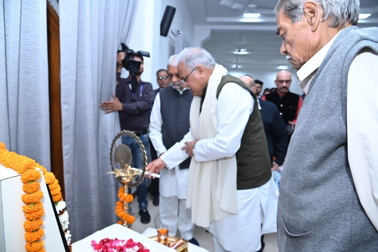 रायपुर : मुख्यमंत्री श्री भूपेश बघेल अपने निवास कार्यालय में स्वतंत्रता संग्राम सेनानी एवं संविधान निर्माण समिति की हिंदी ड्राफ्ट कमेटी के अध्यक्ष स्वर्गीय श्री घनश्याम सिंह गुप्त के जयंती समारोह में शामिल हो रहे हैं