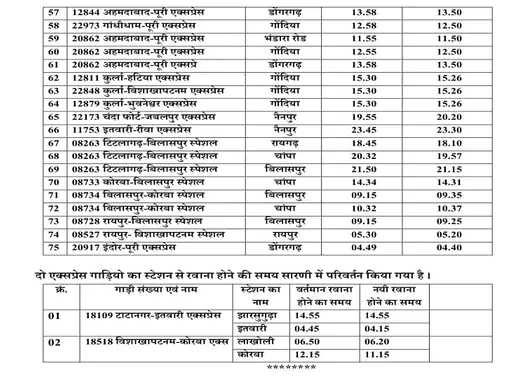 Cg News बिलासपुर जोन स्टेशन से चलने वाली 74 ट्रेनों का समय एक अक्टूबर से बदल जाएगा। रेलवे से जारी आदेश के अनुसार 50 ट्रेनें अब अलग-अलग स्टेशनों में बदले समय पर पहुंचेगी और रवाना होंगी। रेलवे के इस बदलाव से ट्रेनों की लेटलतीफी की समस्या का समाधान होने का दावा किया है। साथ ही इससे ट्रेनों के परिचालन के समय में बचत भी होगी। रेलवे प्रशासन की ओर से हर साल एक अक्टूबर को ट्रेनों के परिचालन समय में बदलाव किया जाता है। इस साल भी रेलवे ने ट्रेनों के टाइम टेबल में आंशिक फेरबदल किया है। उनमें अप व डाउन दोनों दिशाओं की ट्रेनें शामिल हैं। परिचालन समय कुछ प्रमुख स्टेशनों में ही बदला गया है। अन्य स्टेशनों में ट्रेनों के आगमन व प्रस्थान का समय पहले की तरह ही रहेगा। Cg News ट्रेनों का समय जोन के अलग-अलग स्टेशनों में बदला गया है, जिससे…