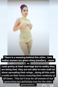 उर्फी का सबसे बोल्ड लुक: उर्फी जावेद ने इंस्टाग्राम पर वीडियो स्टोरी शेयर करते हुए लिखा, ‘इस ड्रेस का एक मतलब है. कैसे इंडिया में औरतों को शादी में सुंदर दिखने के लिए गुलाब और शाइनी जूलरी दी जाती है. लेकिन वो इन्हें पहनने के बाद सही से चल नहीं पाती है.’ उर्फी के इस बयान के सामने आने के बाद इस वीडियो को लेकर फिर चर्चा शुरू हो गई है|