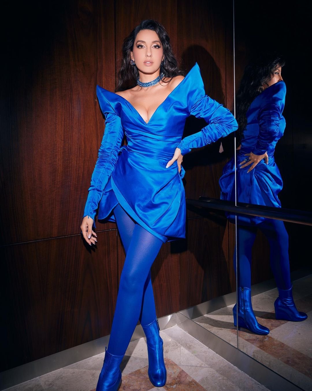 ब्लू मटैलिक ब्लू ड्रेस में नोरा फ़तेह का बोल्ड अंदाज़